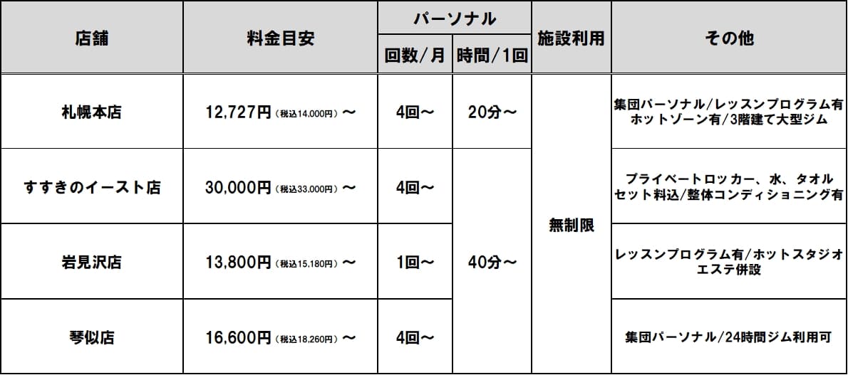 ・月々のパーソナル回数や時間によって料金が変わるので、あなたにあった内容でプラン選択が可能!